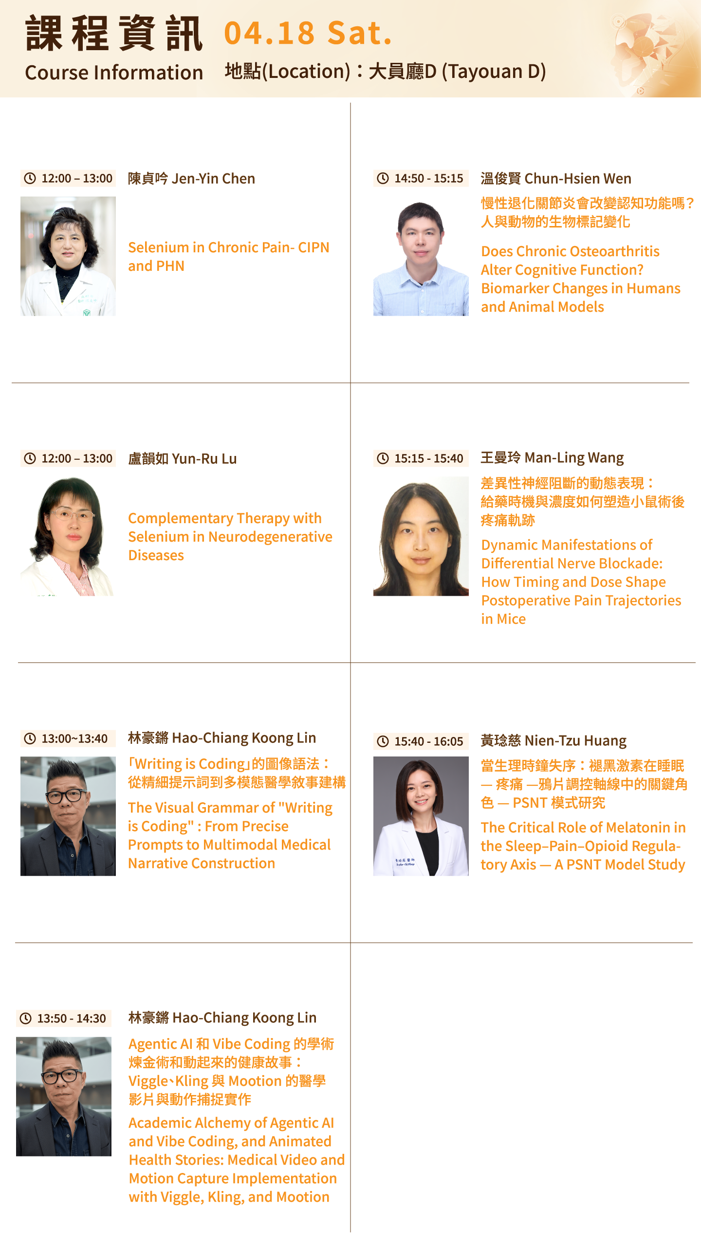 頑固性神經痛(乳房術後疼痛、皰疹後神經痛、頭頸部疼痛)、骨盆會陰疼痛、外泌體轉譯醫學
